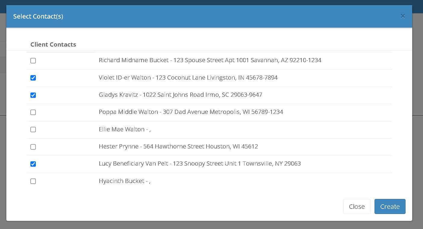 This utility will allow you to create a #10 Envelope for any contact. Use the search tool to find the decedent, once you've selected the desired case, you will see a pop up with all client and participant contacts on this case.