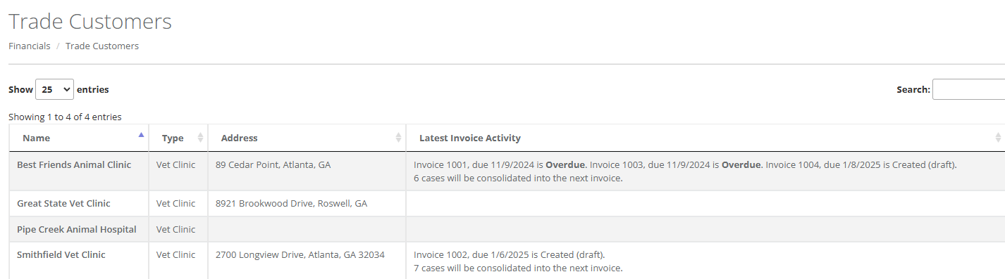 You can see everything about each trade customer's invoicing and case activity by going to the Trade Customer activity screen at Financials/Trade Customer.