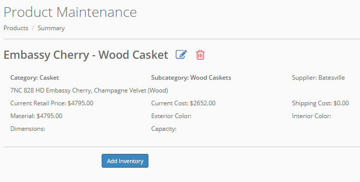 Click the trash can icon to delete the product. Click the edit icon to edit the product. Click the Add Inventory button to add inventory for a product.