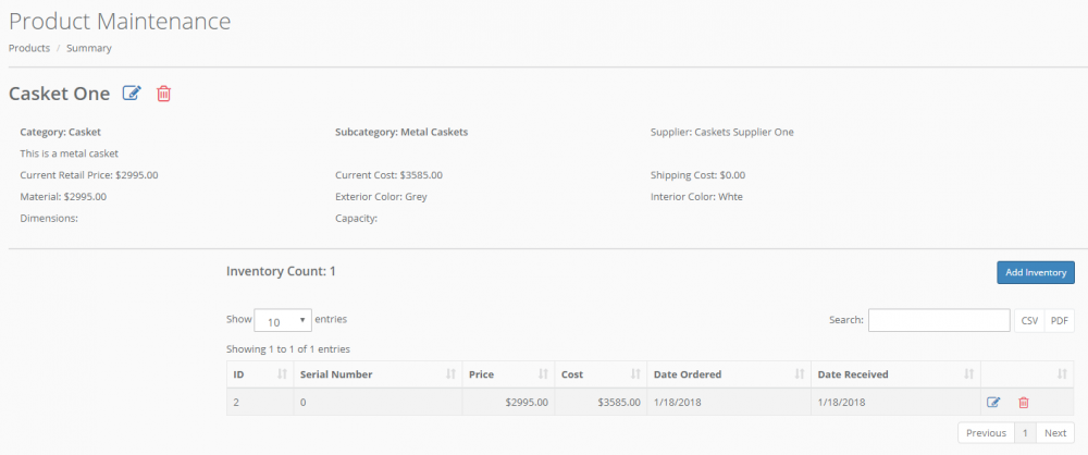 Click the Add Inventory button to add inventory for the product. Enter the quantity to add, the date ordered, and the date received. If you are maintaining serial numbers, enter the serial number(s) for the inventory that you are adding. Click "Save" to complete. To delete a product from your inventory, simply click the trash can icon in its ID row.