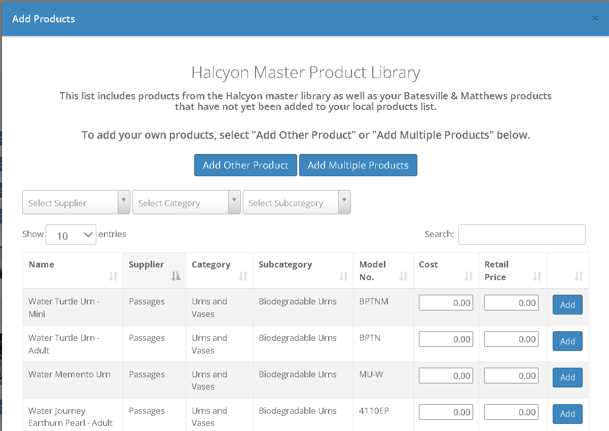 The table contains our master library of products from a variety of suppliers. You can search by supplier, category, or subcategory in the drop-downs, or you can type the name or model number into the search bar. To add a product, simply type in your cost and price for that product, and click the Add button. That product will then disappear from the Product Library table and appear in your products.