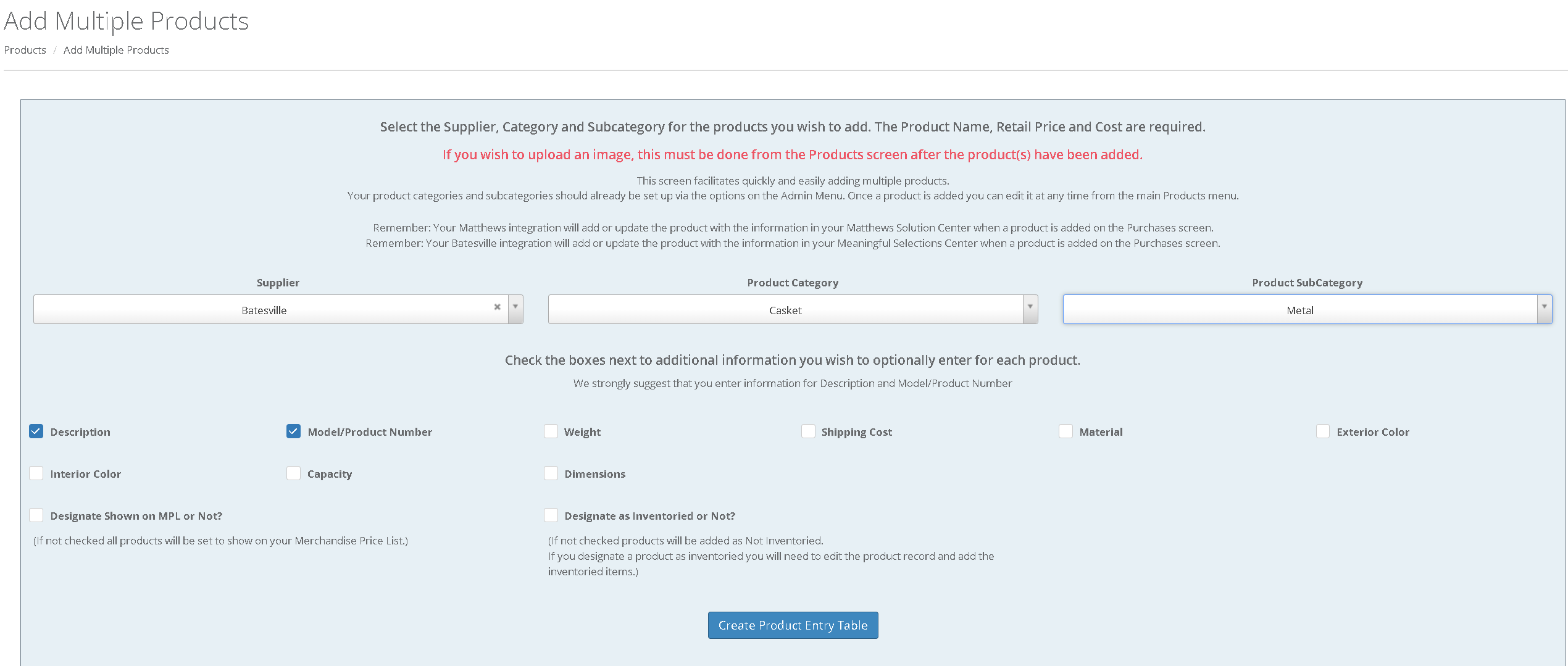 If you wish to add multiple products, select "Add Multiple Products." This will take you to a different screen. Here, you will select a Supplier, Product Category, and Subcategory. You will also select the data fields that you wish to enter. When finished, select "Create Product Entry Table" and you will see a table like this: