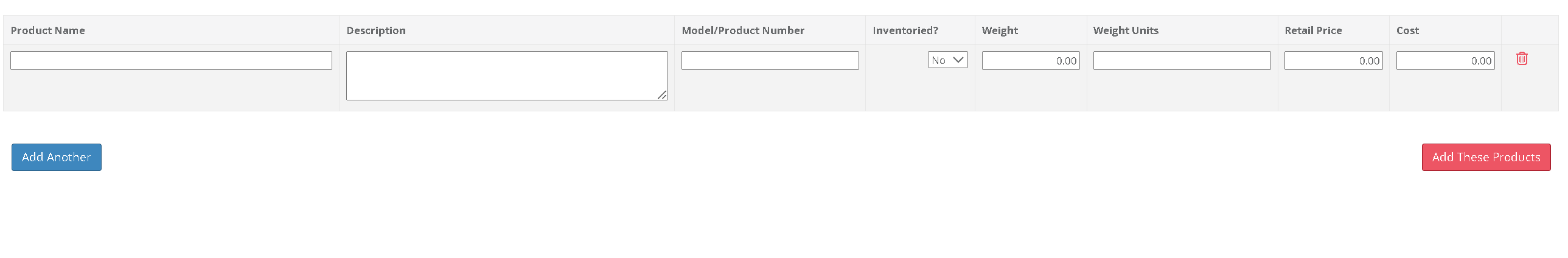 Enter the necessary information, and select "Add Another" to add additional rows to the table. Once finished, select "Add These Products" to add them to your local product library. If you wish to add images to these products, this must be done individually from the main products screen.