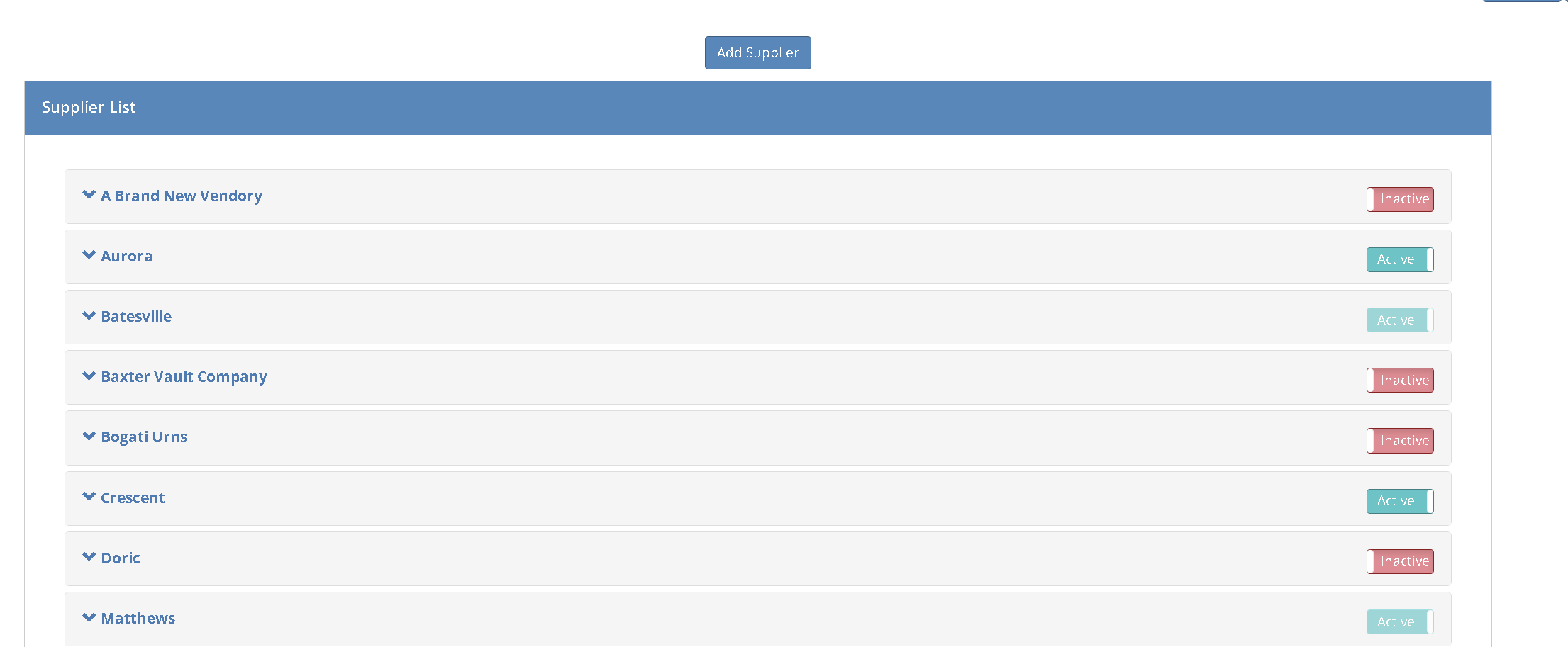 Our Supplier Maintenance page has recently been updated. This page allows you to add, edit, and delete your different suppliers. You can also set existing suppliers to "active" or "inactive". If you are using the Batesville or Matthews integration, these suppliers are not able to be deleted or set to inactive manually. You will need to reach out to Halcyon support if you would like to disable this supplier.