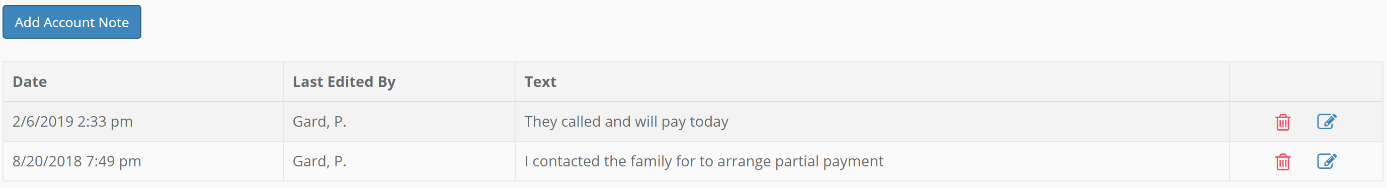 The Case/Account tab is also the only place where collections notes are available. You can enter notes here to coordinate actions to collect. These notes are not used very much so you can feel safe about how they available they are. Halcyon only prints the most recent note on the Accounts Receivable by Funeral Director report.