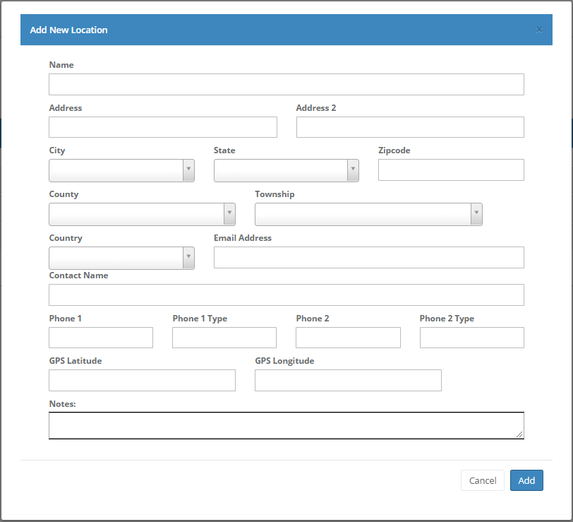 Select "Add Location" to add a new location. Then you will be taken to the following screen, where you can fill out the information for the location and select "Add" to add the new location.