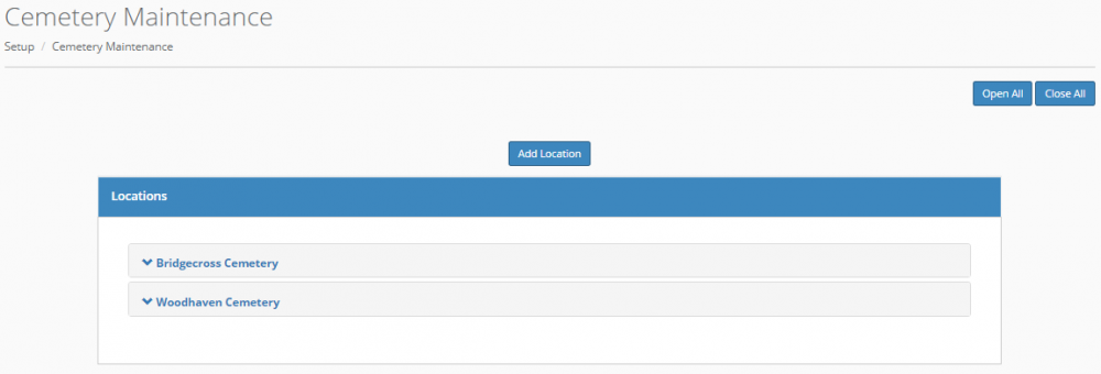 You can add, edit, or delete information on locations such as Cemeteries, Crematories, Places of Death, Places of Service, and Reception Location from Setup > Locations area.