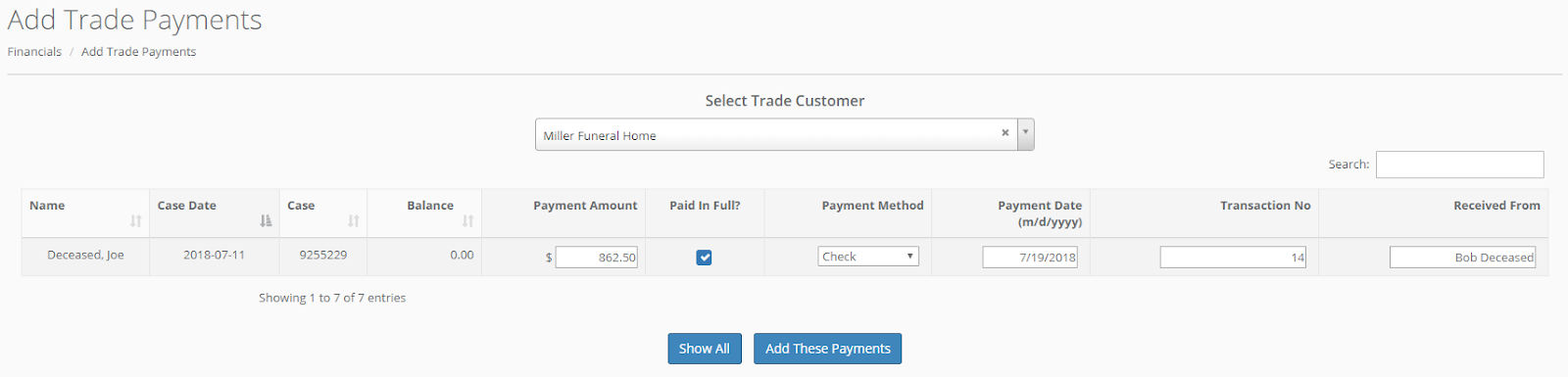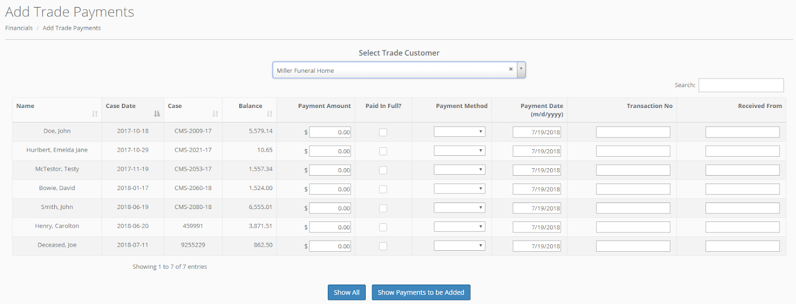 Select a trade customer from the dropdown list, and a list of cases with a balance will display.