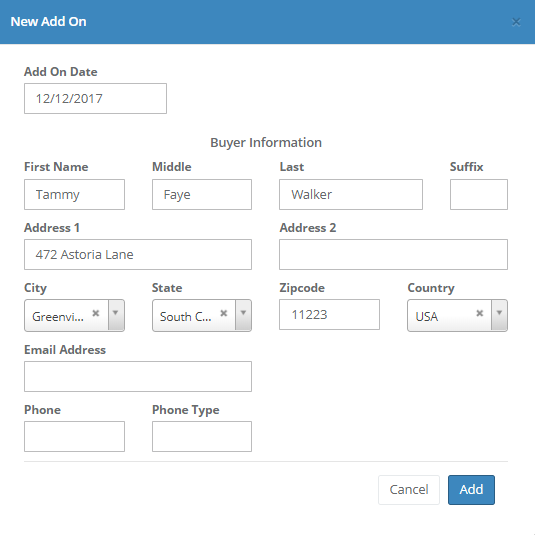 You may select an existing contact as buyer or add a new buyer from this screen. Clicking "Add New Buyer" will take you to the following screen to enter the new buyer information.