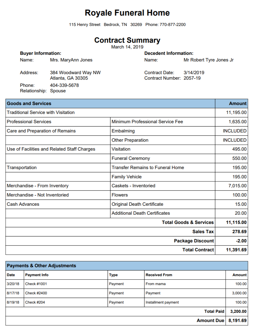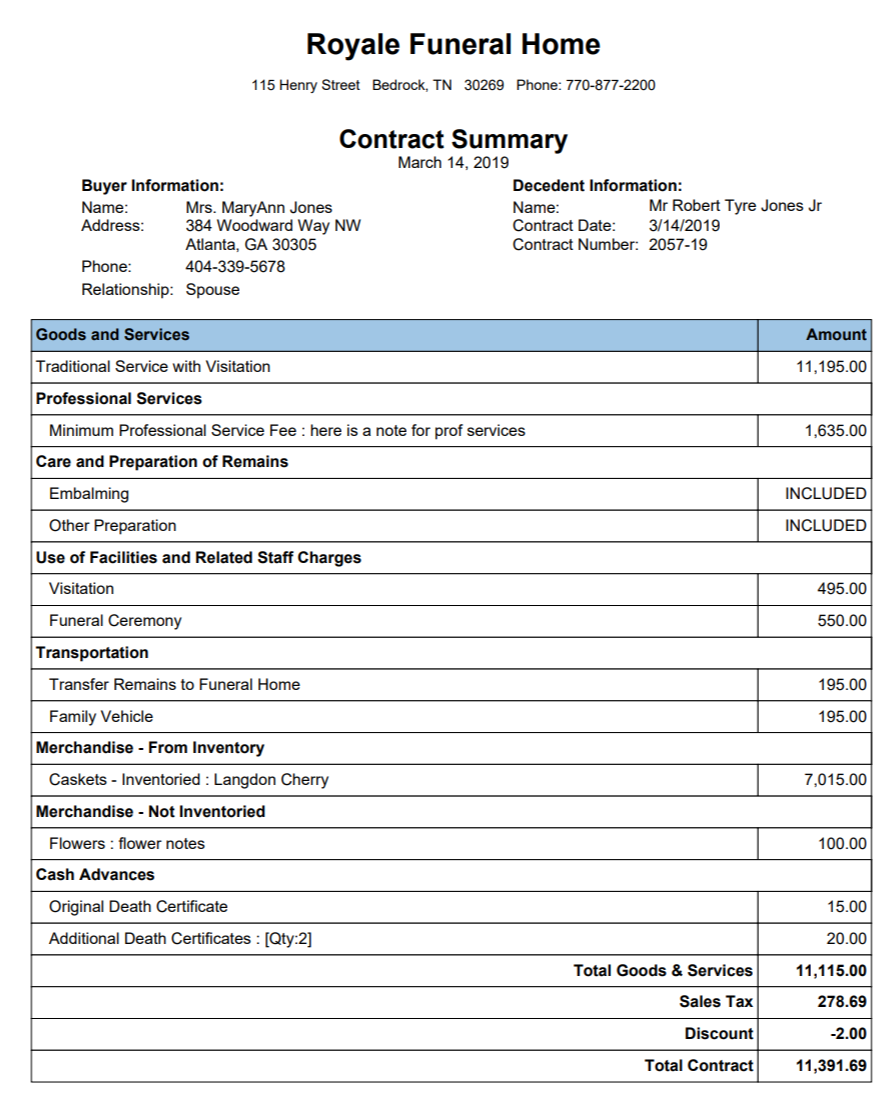 Account Summary - shows many details about decedent and services and also shows contract information.