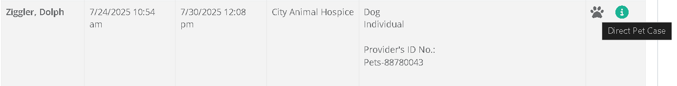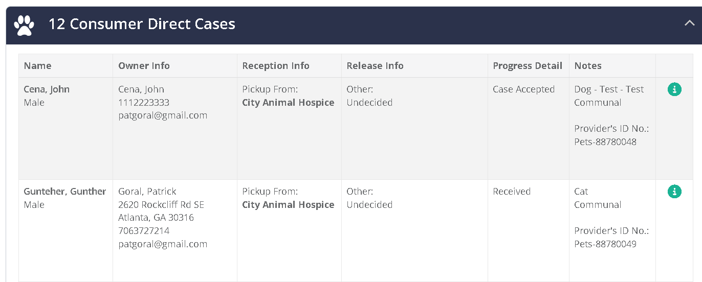 This table will show all cases in which this partner is involved with either reception or release. It shows the case information, reception/release info, the progress detail which shows the current tracking step, and notes. Selecting the green "i" icon will show additional case information. Once a case has been moved to the Ready For Release or Released steps, these cases will move to the respective "Ready" or "Released" sections on the portal. These cases will appear with a paw print icon to indicate that it is a Direct Pet case.