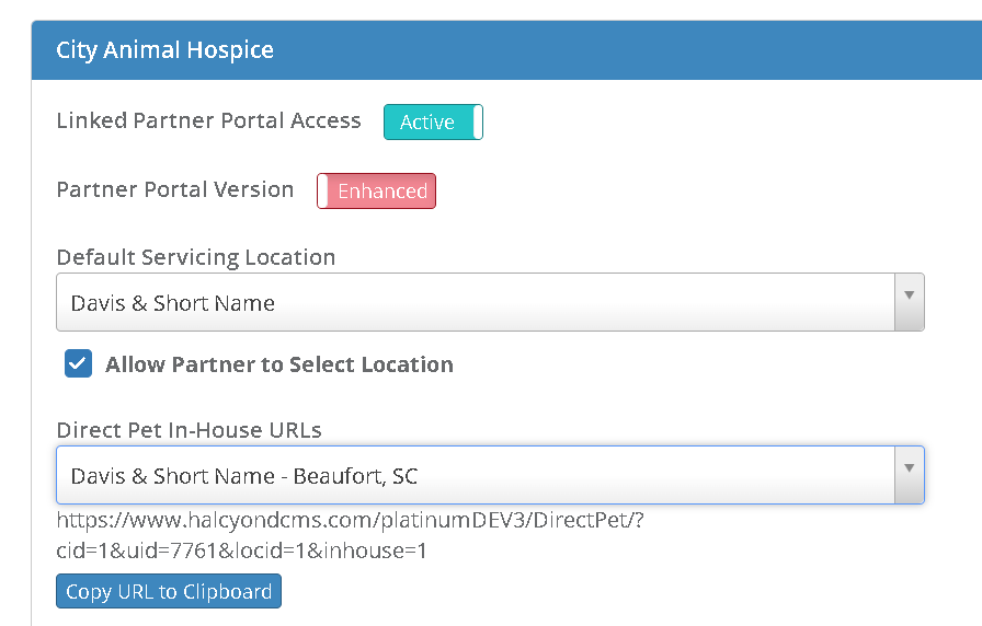 On the Admin->Partner Portal Access page, enabled clinics will have a "Direct Pet In-House URL" section. If you have multiple locations, each location will appear in this dropdown. Once you select the location, you can copy the URL to provide to your partners.