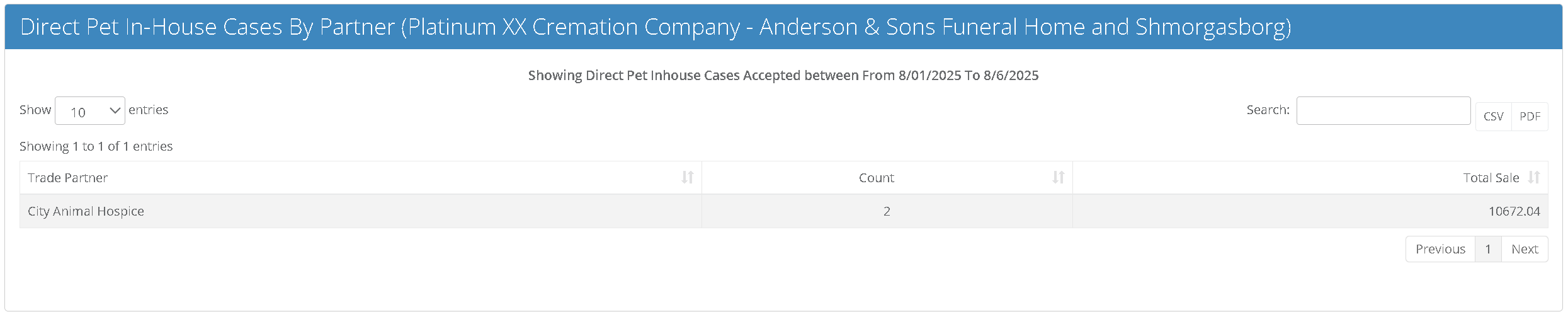 Under Reports, select "Direct Pet In-House Cases By Partner." This report will show a count of all In-House cases for the selected time period, as well as the the total sale amount for all of these cases.