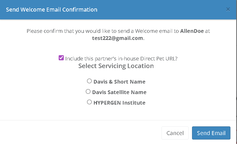 Selecting the green envelope icon will show a pop-up asking if you'd like to send a welcome email to this user, as well as asking if you'd like to include the Direct Pet In-House URL. If you select that checkbox, it will show the names of your locations so that you can select the servicing location you would like to designate for that partner.